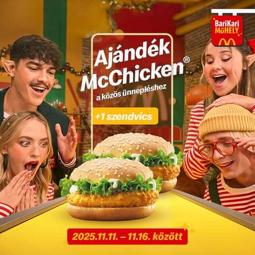 További részletekA BariKari Műhely mostani meglepije a McChicken® fanoknak (és lopkodós) barátaiknak szól! 🎁🐓2025.11.16-ig most minden étteremben rendelt vagy kuponnal vásárolt McChicken® szendvics vagy menü mellé egy ajándék McChicken® szendvicset adunk!*