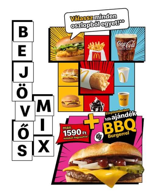 ** A Bejövős Mix ajánlatban 1db burger; 1db köret vagy desszert; és 1db ital vagy shake választható az ajánlatban elérhető termékek közül. Az ajánlat 2025. szeptember 2. és szeptember 30. között +1 db ajándék BBQ burgert tartalmaz. Az ajándék burger más termékre nem cserélhető az ajánlatban. Az ajánlat 2025. szeptember 2. és szeptember 30. közötti tartalma részletesen: 2 db burger (1 db Chickenburger jalapeno / Mustáros sertésburger / Sertésburger és 1 db ajándék BBQ burger) ; 1 db kis burgonya vagy Forró almás pite vagy öntetes McFreeze®; és 1 db közepes szénsavas üdítő vagy Lipton® Ice Tea vagy kis shake vagy kis hosszú kávé (kizárólag koffeines változatban). Az ajánlat éttermeinkben 10:30 és 22:00 óra között elérhető. A Mustáros sertésburger és a BBQ burger Pécs Árkád és Tatabánya Vértes éttermeinkben nem elérhető, így a +1db ajándék termék ezen éttermekben nem elérhető a Bejövős Mix ajánlatban. Az ajánlat házhozszállítási szolgáltatással (McDelivery®), a Budapest Parkban és Siófok Plázs éttermeinkben nem elérhető. A Mustáros sertésburger szeptember 2-től megújult zsemlével érhető el. Az ár helyben fogyasztás esetén értendő. Elvitelre történő vásárlás esetén elviteli díj kerül felszámolásra vásárlási tranzakciónként egyszer. Az ajánlat házhozszállítási szolgáltatással nem elérhető. További részletek az éttermekben és a https://www.mcdonalds.com/.../Ajanlatok/bejovos-mix.html weboldalon. A kép illusztráció.